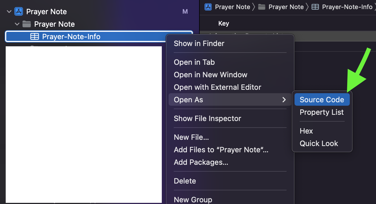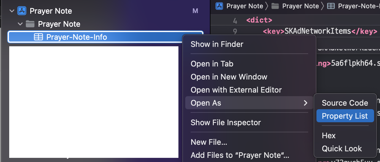 만약 에러가 발생하면, Info.plist를 Property List로 열고