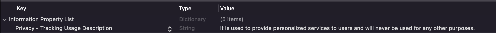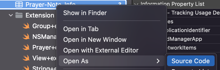 NSUserTrackingUsageDescription 와 같은 이름은 Info.plist 파일을 오른쪽 마우스 클릭 시 나타나는 메뉴에서 SourceCode로 보면 알 수 있다.